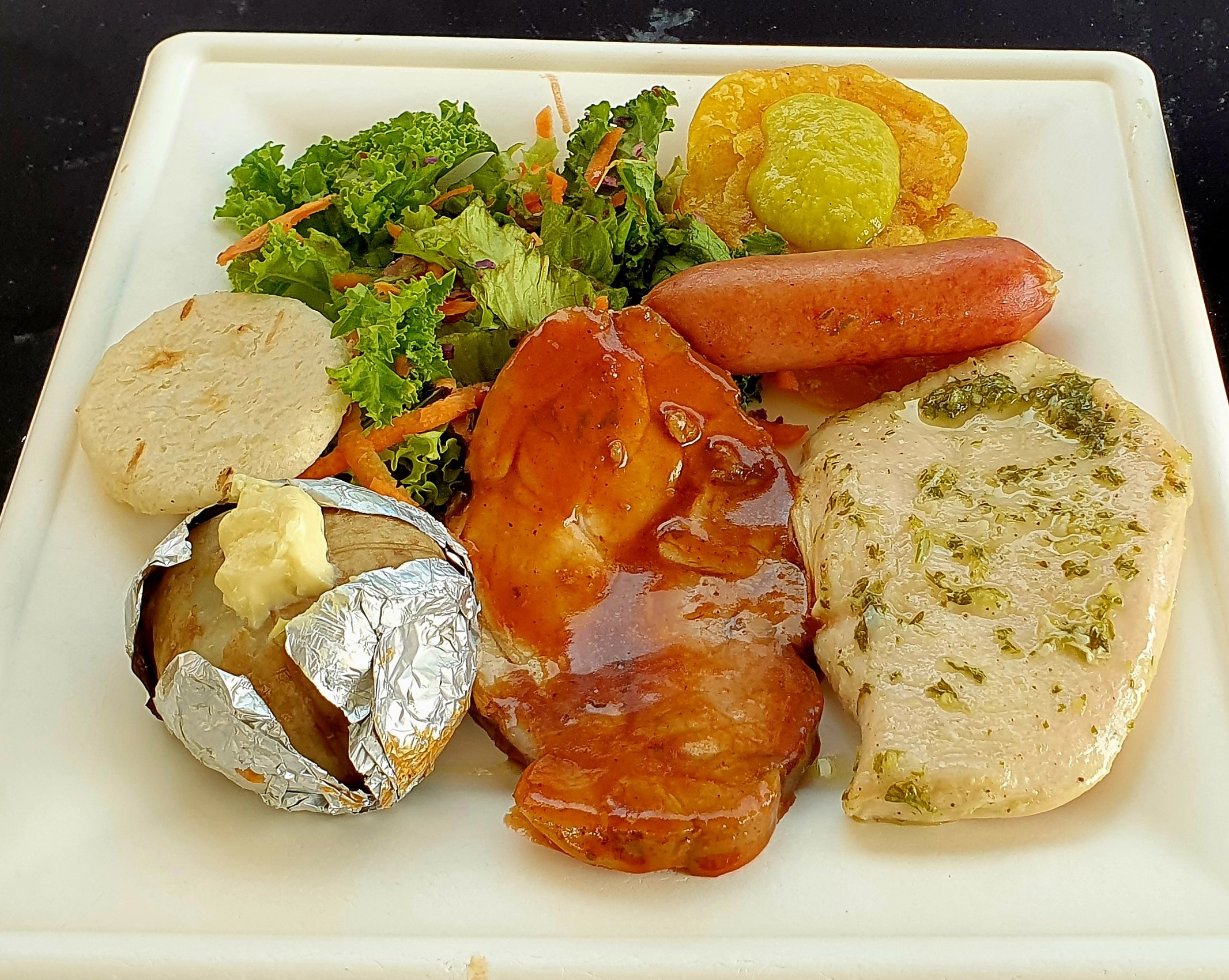 Asado mixto con Pechuga de pollo 100 g, chorizo 50 g, planchita de cerdo 100 g, mini patacón 8 g, hogao 20 g y guacamole 20 g, 1 und arepa, 1 und papa cocida, ensalada 60 g y bebida de 200 ml.