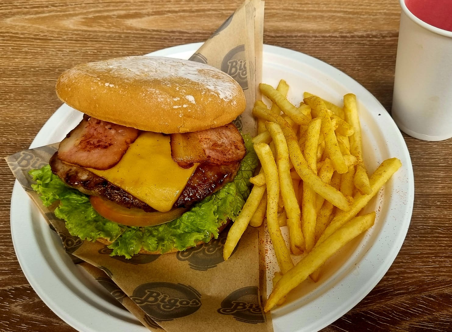 Combo hamburguesa artesanal: Pan artesano, carne 1/4 de libra de res o pollo de 125 grs, 1 tajada de queso, cebolla grille o tocineta, salsas, acompañado de papas chips 25 gr, bebida de 200 ml.