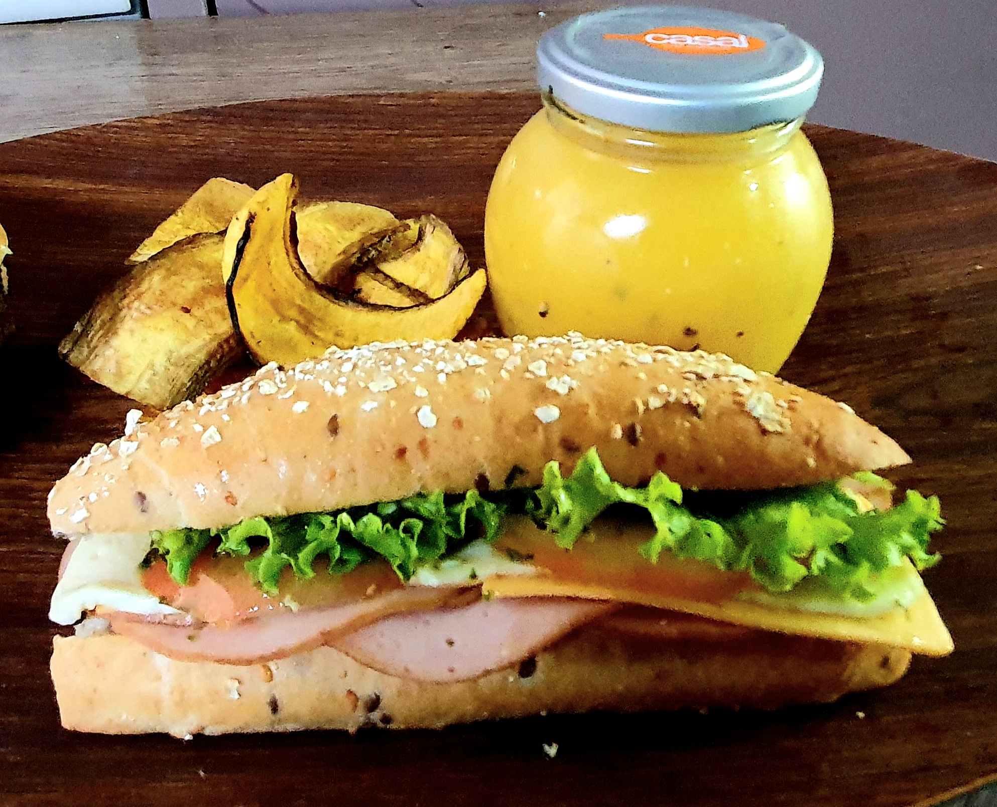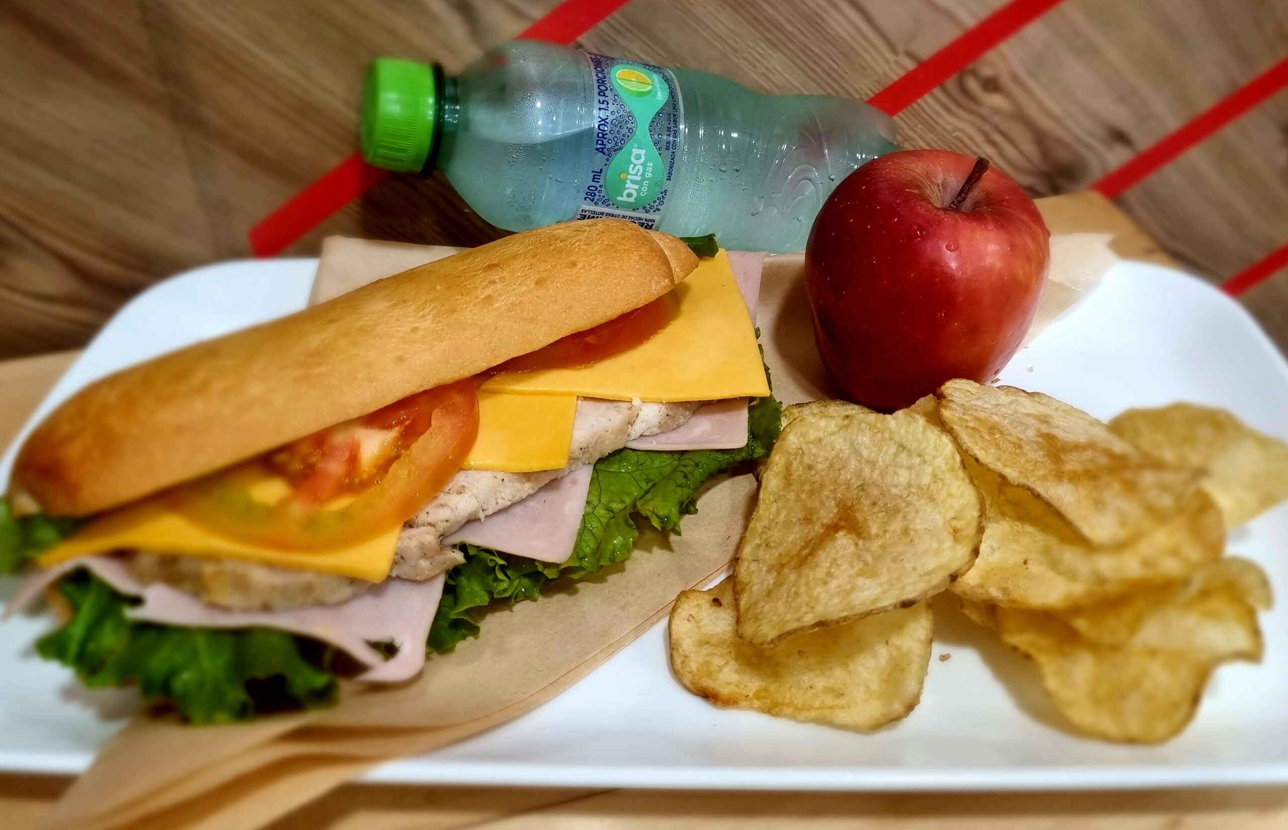 Combo sánduche especial: En pan danés o artesanal o integral o tortilla con lomo de cerdo y jamón de pollo 60g, miel mostaza al curri, queso mozarela y queso amarillo vegetales, fruta de temporada, papas o platanitos chips 25g y bebida. Agua sabo de 200 ml.