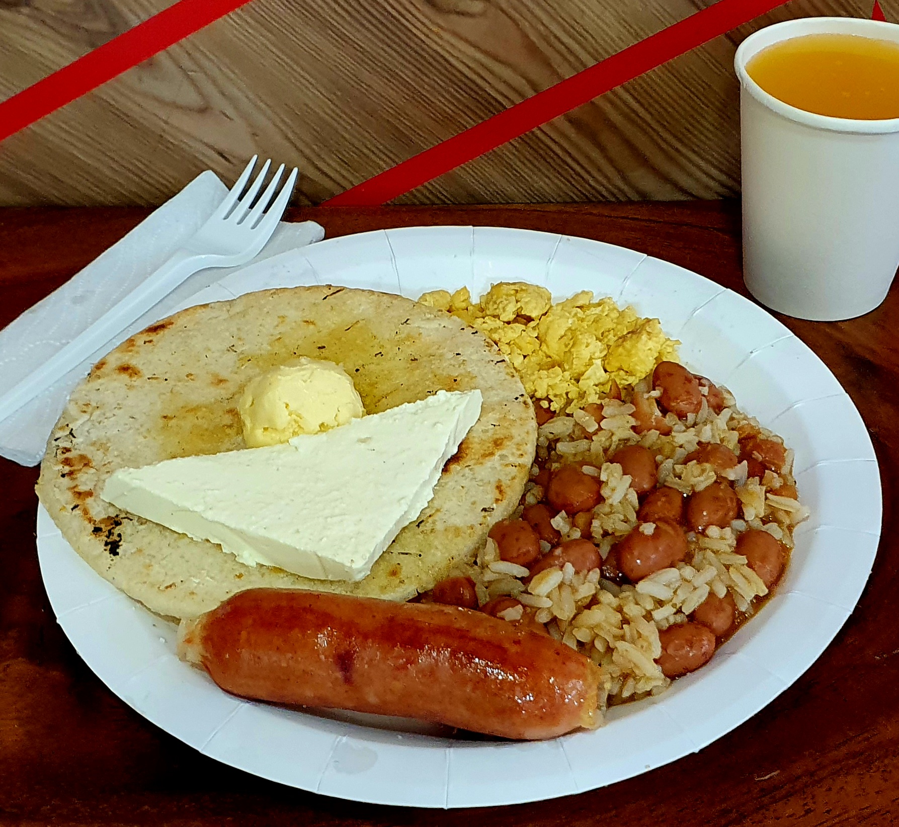 Calentado de fríjoles 150 g, 1 und huevo frito, chorizo 50 g, 1 und arepa media tela con quesito 40 g, bebida de 200 ml.