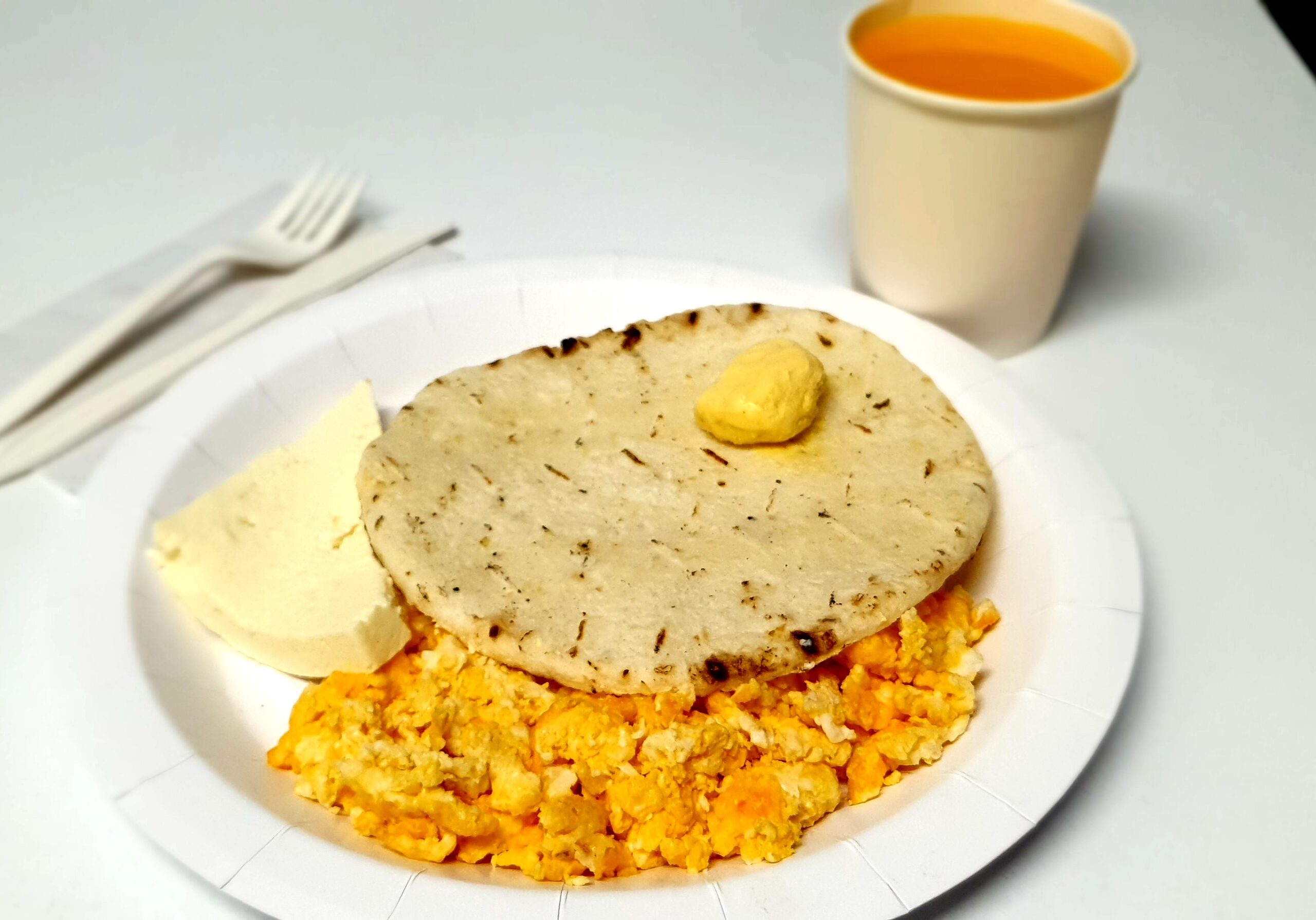 Huevos revueltos (2 unidades), arepa tela con quesito 40 grs y Bebida de 200 ml.No recomendado para grupos mayores a 50 personas
