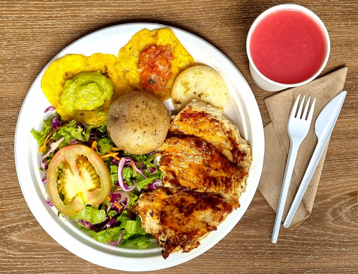 Planchita pollo 140 grs,1und papa al vapor o americana, arroz 120g, ensalada 60 a 80g, 1 arepa, bebida 200ml.