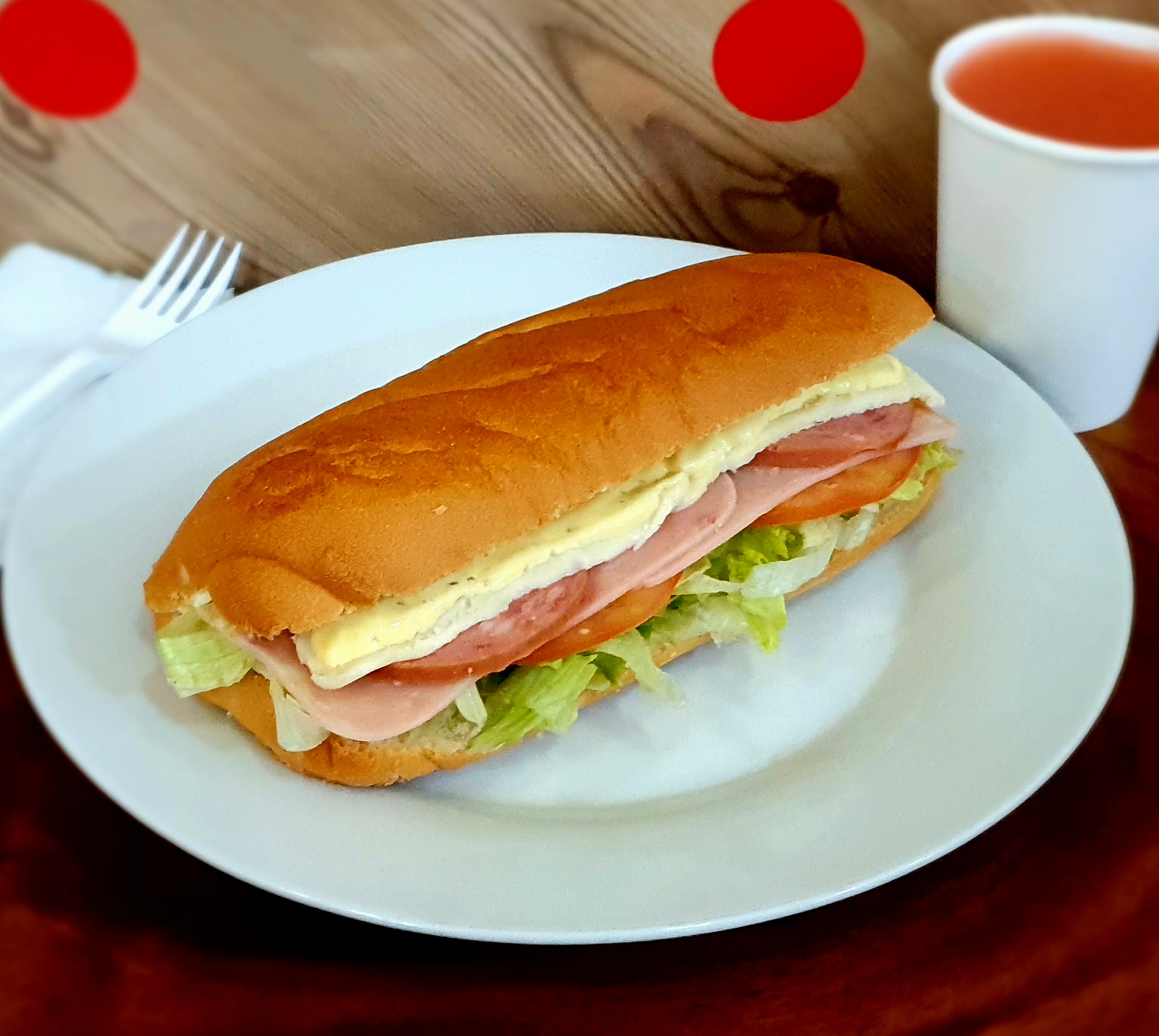 Sanduche Cubano con Pan tipo cubano, carnes frías 2 tajadas, doble queso 40 g, lechuga, tomate, salsa showy, bebida de 200 ml.