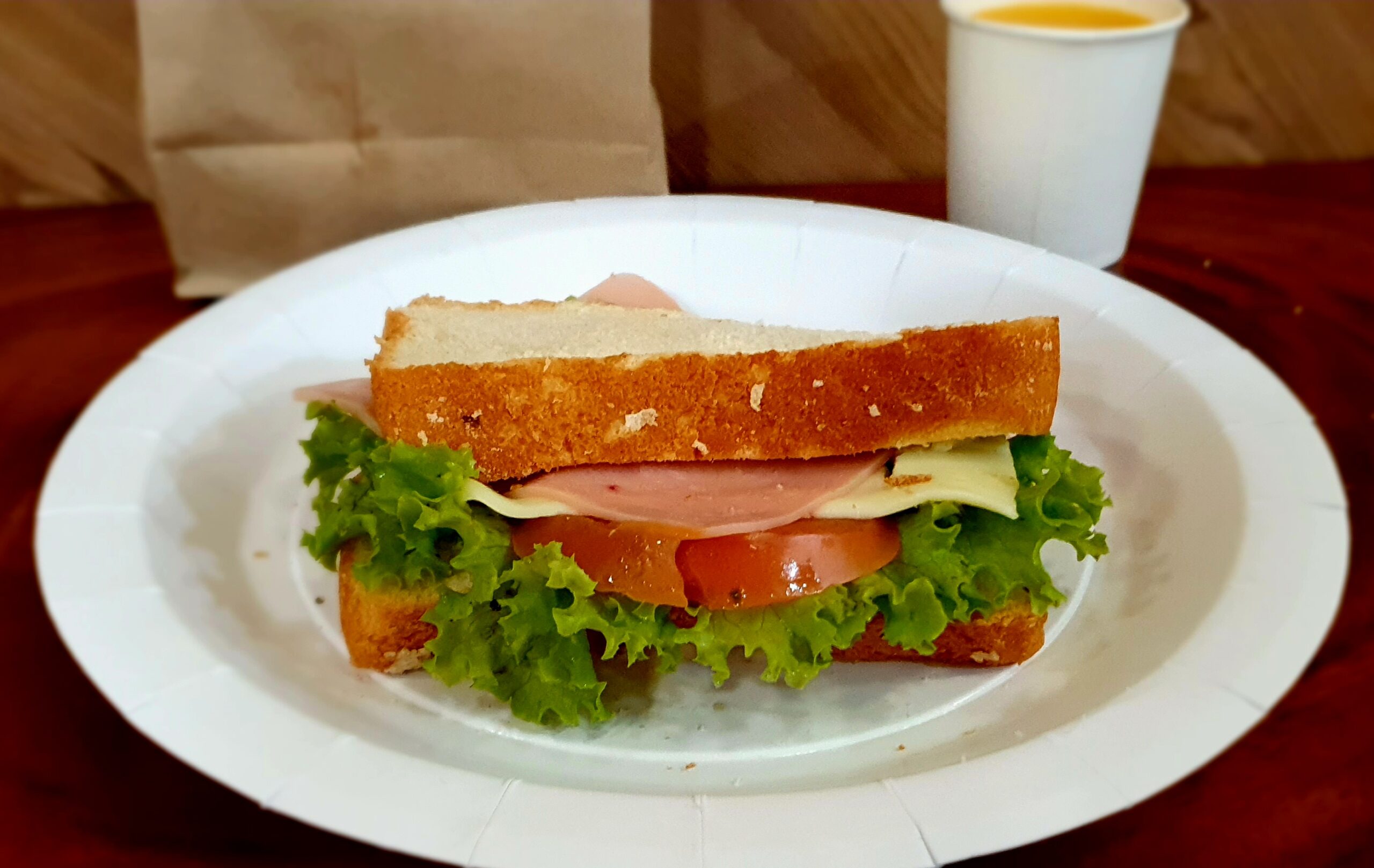 Sanduche en pan integral con jamón y queso. La opción Vegetariana va con tomates salsa pesto, queso mozarela (1 tajada) 1 bebida 7 onza (café con leche o chocolate o jugo).