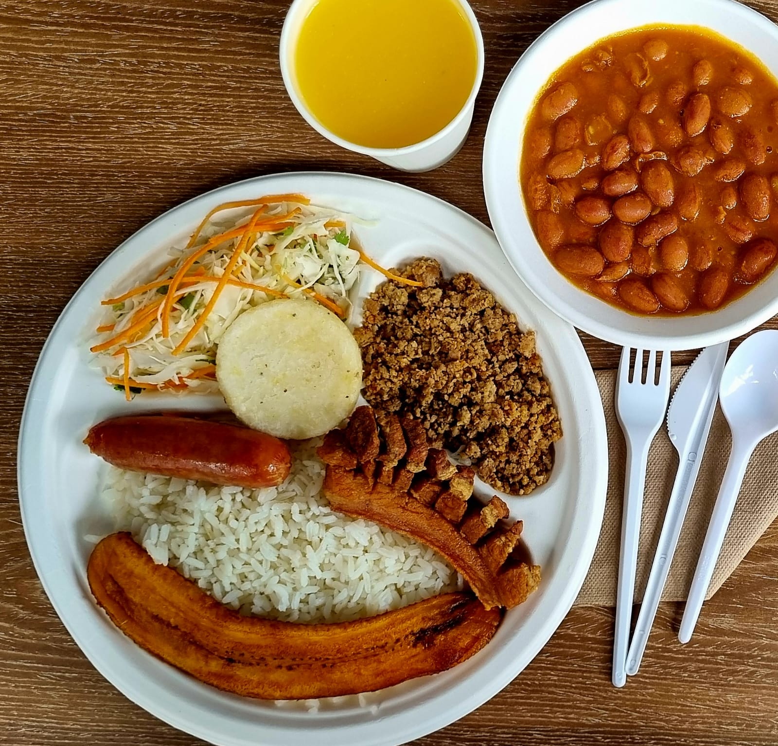 Típico tres carnes: Fríjoles 240 g, arroz 120 g, ensalada 60 grs, tajada de maduro 50 g, chicharrón 100g, chorizo 50 g, carne molida 40 g, arepa y bebida de 200 ml.